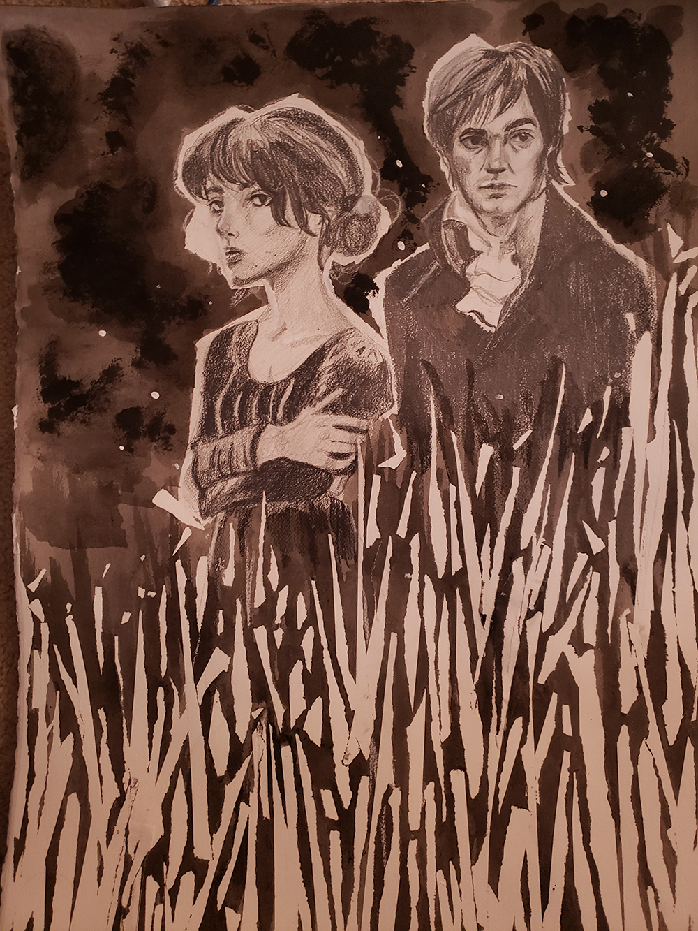Pride and Prejudice is a title really close to my heart. I especially love the emotional adaptation that the 2005 movie pulled off, so I wanted to use this piece to give tribute to the title as a whole. I have ambivalent feelings about ink as a medium. I love that it can be refined or messy on the page. I love looking at ink pieces. It’s a challenging and fun medium for me, and I felt like it was a good pair for the mixed feelings the characters in Pride and Prejudice work through. For my second medium, I chose to work with pencil because I like the additional texture it created.