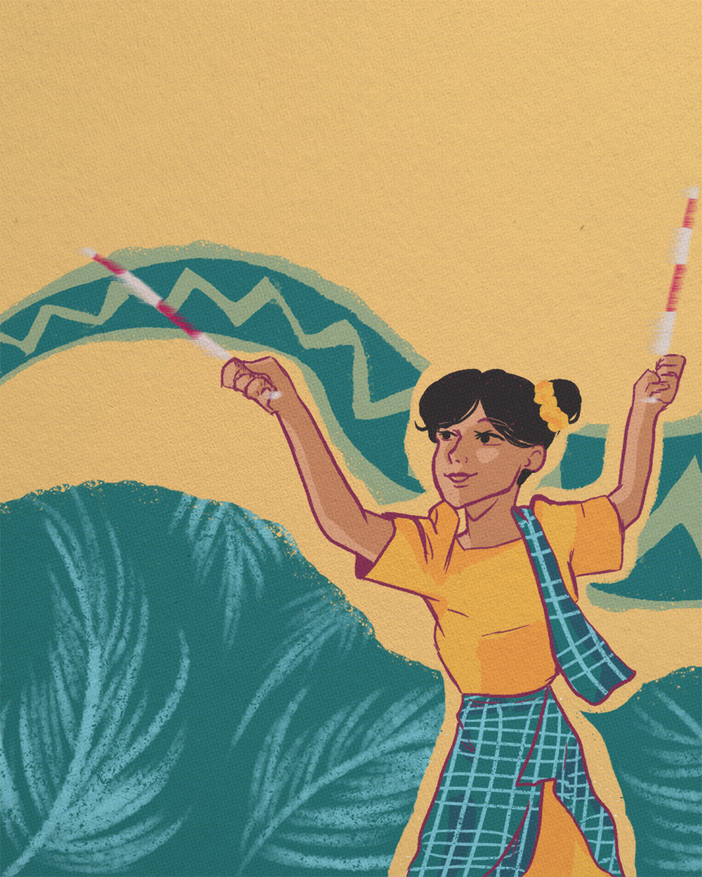 I selected a vibrant palette that aligned partially with the organization hosting the event, but also would evoke some of the tropical aspects of the Philippines. Additionally, I selected a cultural dance that I love seeing performed. The dance depicted is known as “Sakuting.” It is a dance that evokes the energy of a fight between two groups of people, and utilizes arnis sticks. Originating from the Ilocano region of the country, sakuting was traditionally performed by only men, but in modern times is performed by all genders. The illustration also depicts the anahaw leaf, which is the national plant of the Philippines, and a pattern that utilizes triangles, which is commonly seen in some traditional tattoos. I chose to finalize the image with some textural overlays in order to give the image a more tangible feeling, since it would only be shared digitally.